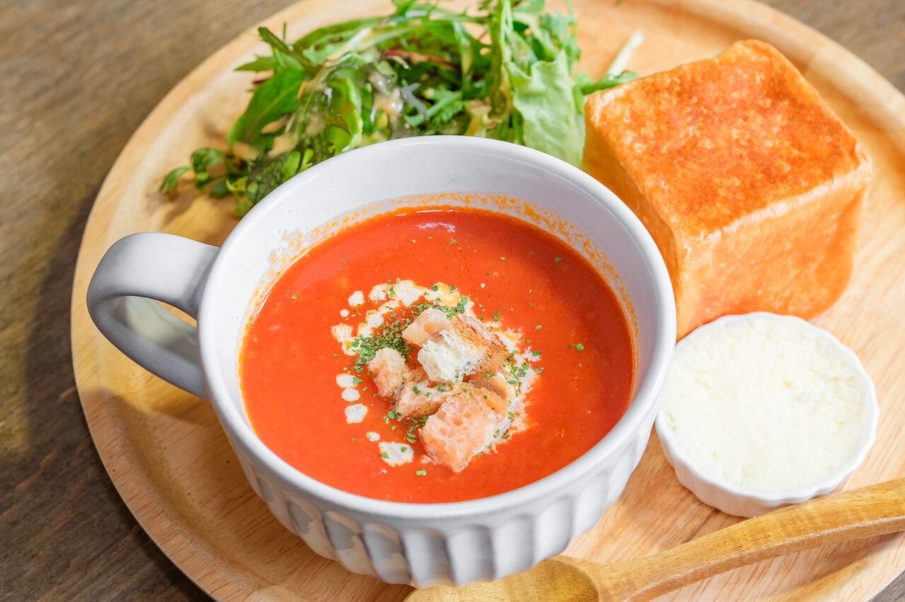 ②焼き立てキューブパンが食べられるモーニングや地場産野菜がたっぷり食べられるランチプレート