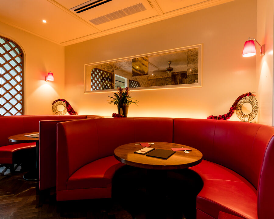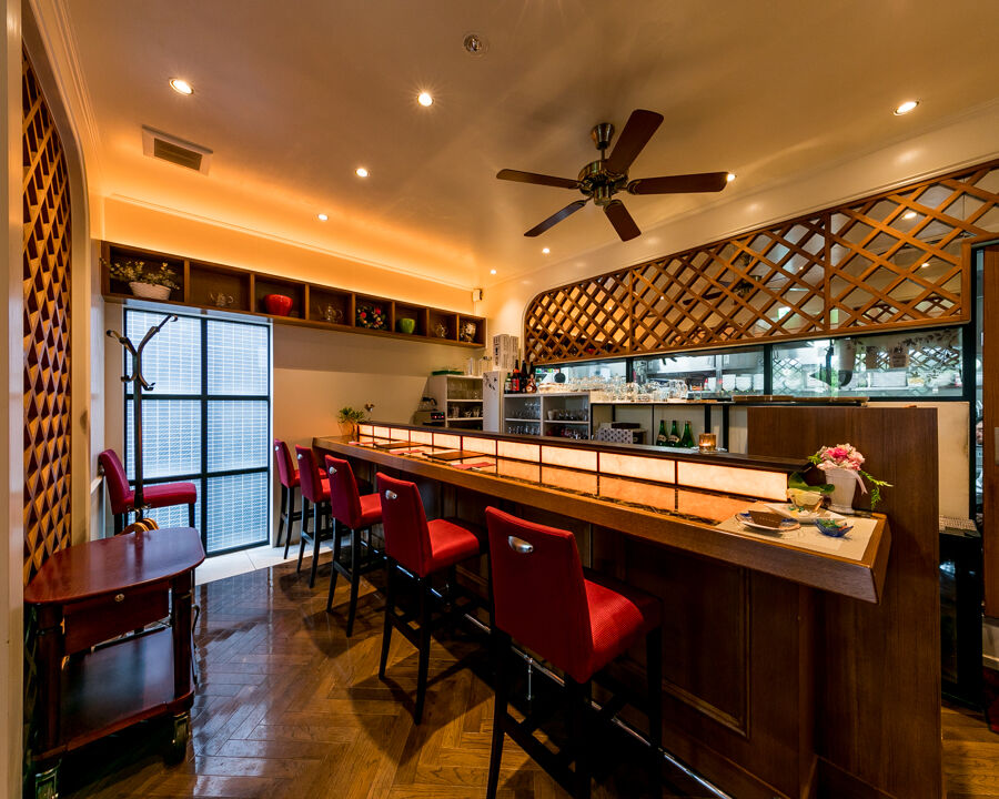 ②シックなワインレッドを基調とした解放感溢れる空間。